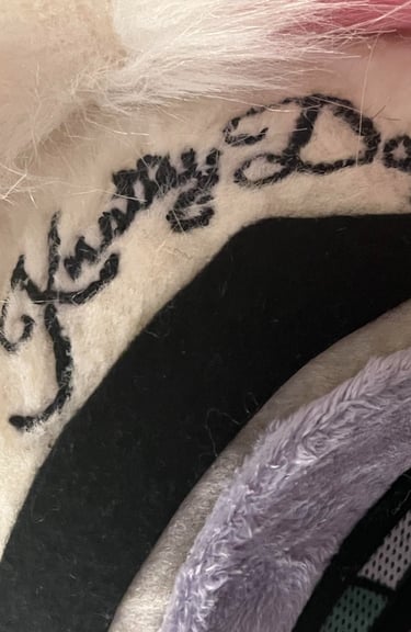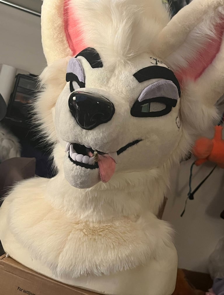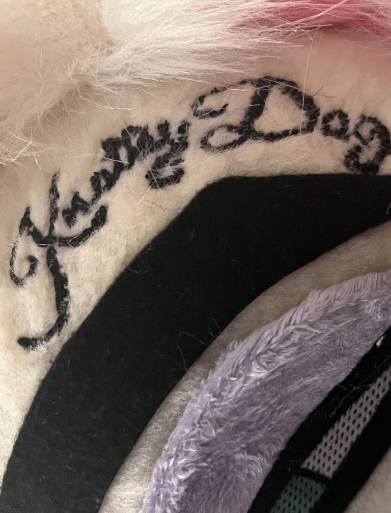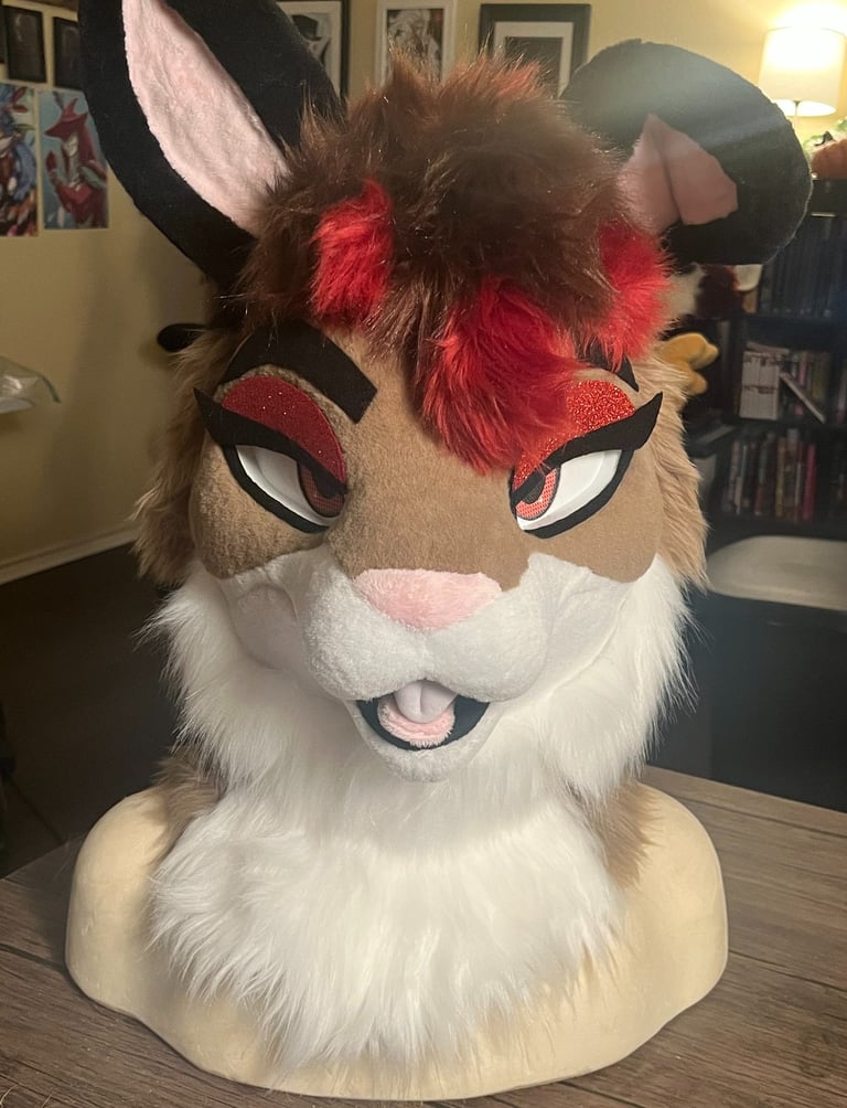 Features: interchangeable eyelids, poseable tongue, fully lined /w scuba knit, floppy ears, head/neck zipper for snug fit, hair is layered and sewn on piece-by-piece for texture and style