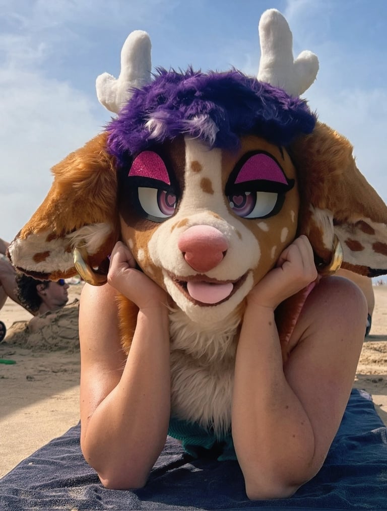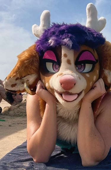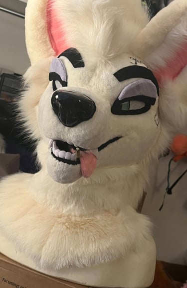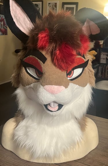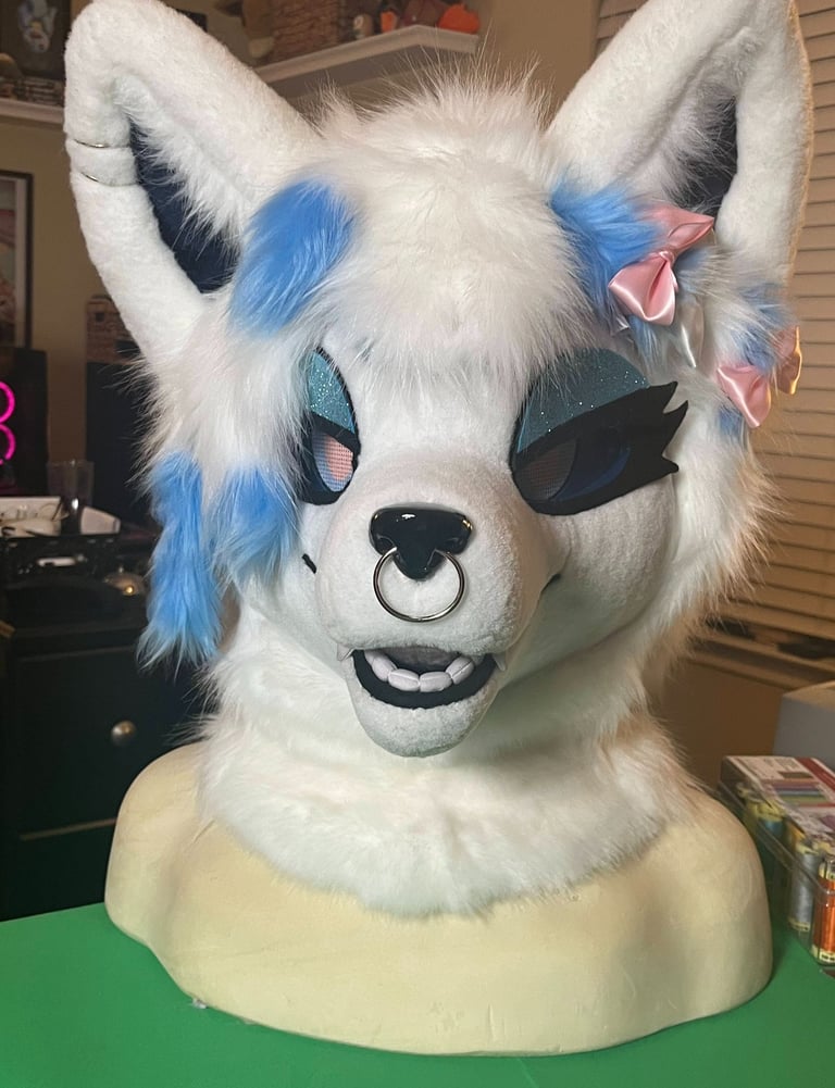 Design/Style: Went for a very masculine presentation with thicker brows and angular face. Really leaning into the deviousness of this character with the eye angles. This one was a fun challenge because it involved using embroidery techniques for the tattoo effect and a PLA nose coated in UV resin to really push that realistic wet nose effect. Lots of layered hair leaning into a sort of mullet.